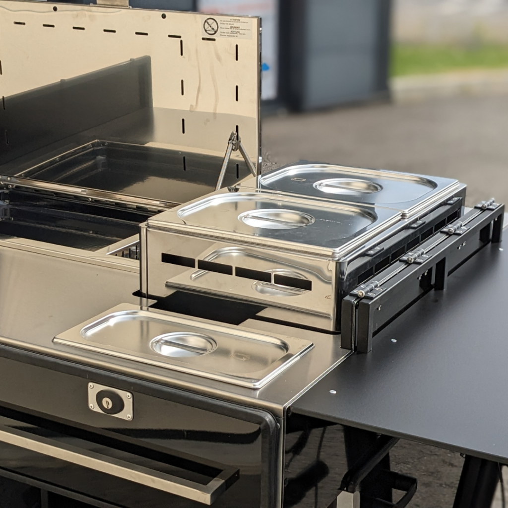 Un grand plateau déployable permet d’accueillir vos clients ou doubler la surface de préparation.