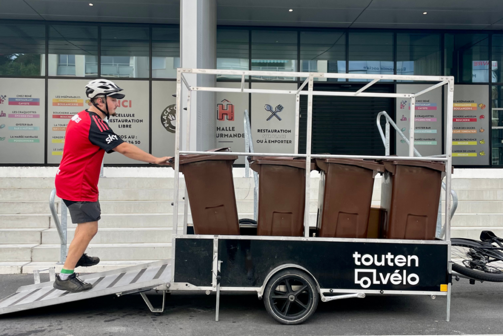 De leur côté, Toutenvélo Le Havre utilise une remorque ridelle avec arceaux et rampe. Ainsi ils peuvent transporter jusqu’à 4 bacs de 120 litres. Sa hauteur leur assure une sécurité du chargement et d’apposer leur signalétique.