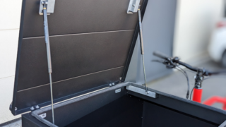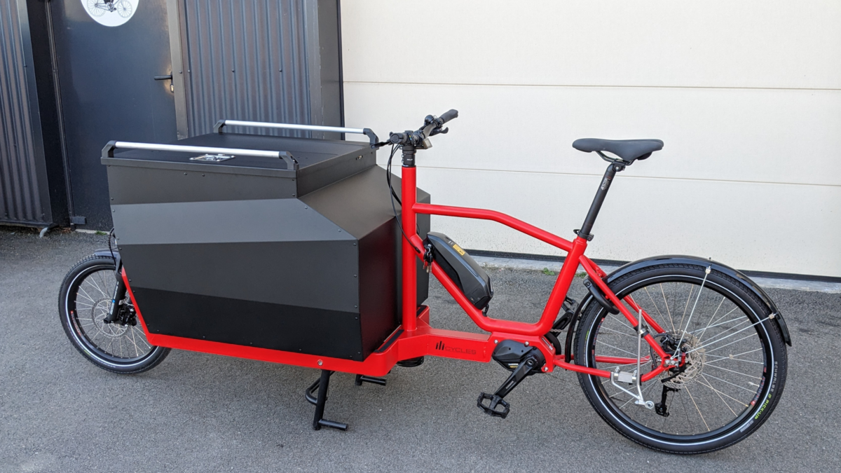 Caisson personnalisable en alu Dibond ou aluminium avec vérins, serrure renforcée et galerie. Caisson présenté ici sur le Bili 800, compatible avec les biporteurs de plateforme de plus de 800 mm de longueur.