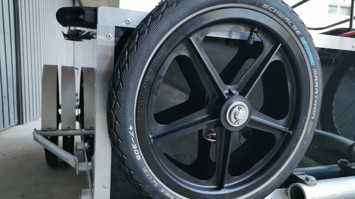 Livrée avec une jante, une chambre à air, un pneu Schwalbe Marathon et 2 goupilles inox.